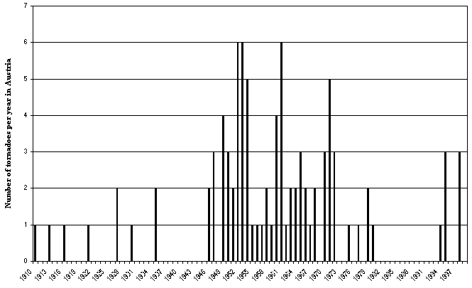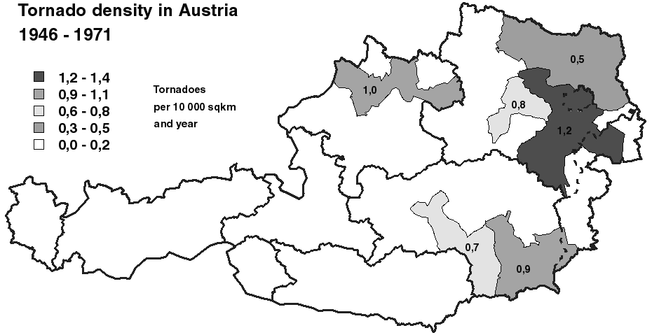 Taking the most representative data set of Pühringer (1973) as basis, we can find an average of 2.7 (with a standard deviation of 1.8) tornadoes per year in Austria. Record years were 1952, 1953 and 1961 with 6 tornadoes each, followed by 1954 and 1971 with 5 tornadoes each year. Whereas in the alpine regions less than 0.3 tornadoes per 10000 km² and year are counted (averaged for provinces or major parts of a province), we can count 0.9 in the greater Graz area, 1.0 in the greater Linz area and 1.2 tornadoes per 10000 km² and year in the greater Vienna area (Figure 5). The overall average for Austria (area: 83855 km²) is 0,3 tornadoes per 10000 km² and year. That number seems to be slightly higher than in the neighbouring country Germany (Dotzek et al., 1999; Dotzek, 2000), but only if we behold the data set of Pühringer (1973) representative.
